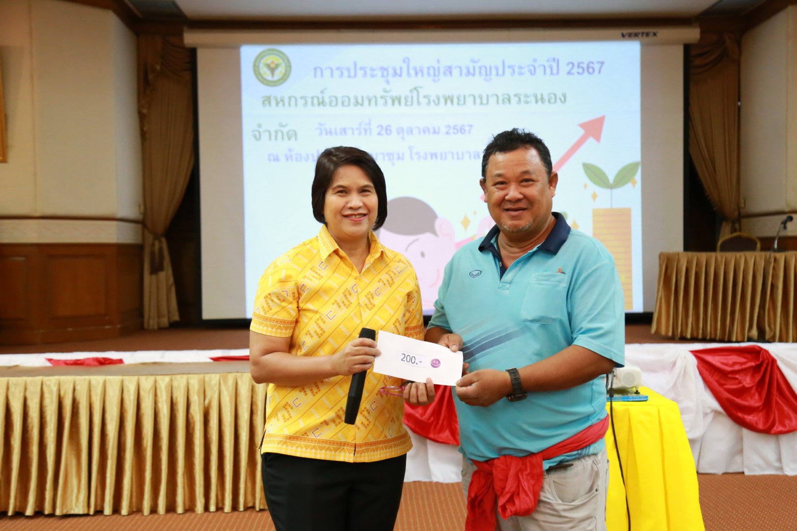 สหกรณ์ออมทรัพย์โรงพยาบาลระนอง จำกัด.มอบสวัสดิการให้แก่สมาชิกผู้เกษียณอายุราชการ.ประจำปี 2567 มอบโดย คุณวณิชา ลิ่มศิลา.ประธานกรรมการ และคุณพิมพ์ใจ เหลืองอ่อน รองประธานกรรมการ พร้อมผู้จัดการ